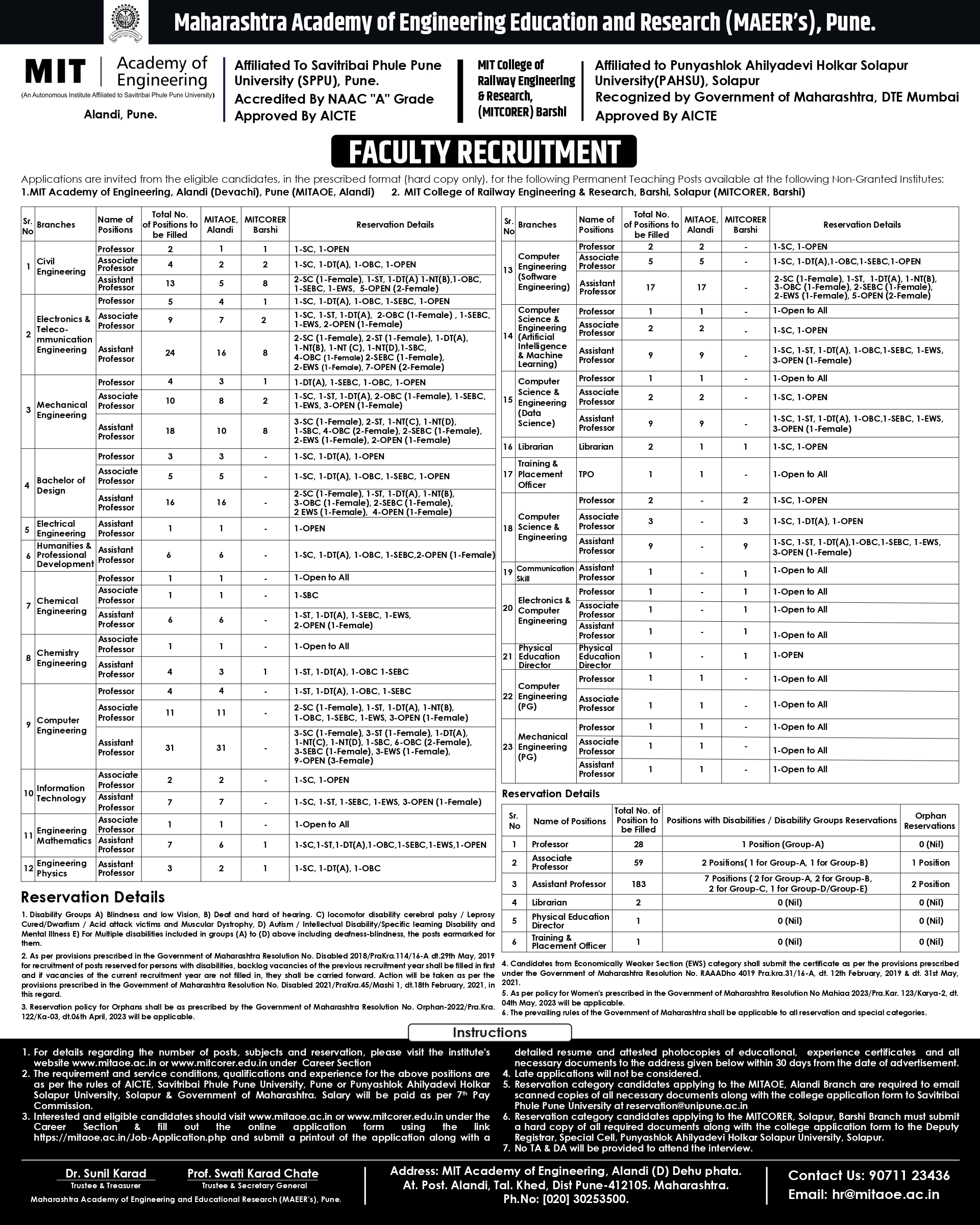At MITAOE, we are continually seeking dynamic candidates for full-time, adjunct/part-time, and visiting faculty positions in one or more of the relevant fields such as Engineering, Design Thinking, Humanities and Social Sciences, Communication and Language Skills, Sports etc.